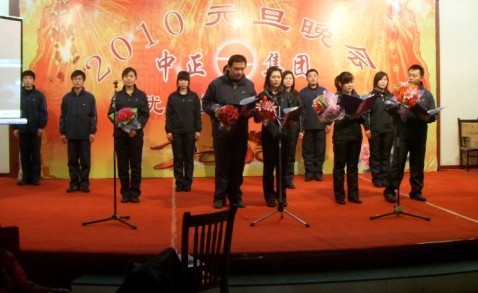 本次年會共分為三部分。第一部分是2009年總結(jié)會,于上午成功召開;第二部分是2009年優(yōu)秀員工頒獎大會,于下午三點隆重舉行,來自集團及分公司的十二位優(yōu)秀員工受到表彰;第三部分是2010年元旦晚會,于下午四點開始,在一派喜氣洋洋中,應(yīng)邀嘉賓、集團及各分公司領(lǐng)導(dǎo)、集團及各分公司員工、員工家屬等共計200余人一起度過了美好而難忘的快樂時光。